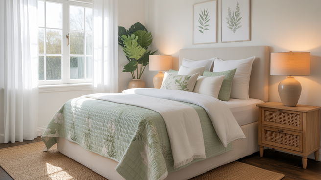 Look for bedding made from natural fabrics like cotton or linen. These materials allow airflow and create a relaxed, effortless look. Instead of bulky duvets, try a lightweight quilt or coverlet layered over crisp sheets.