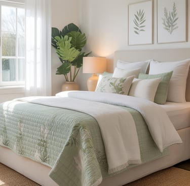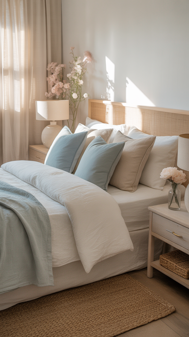 Using these colors in bedding, pillows, and decorative accents helps the room feel cohesive and serene.