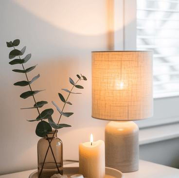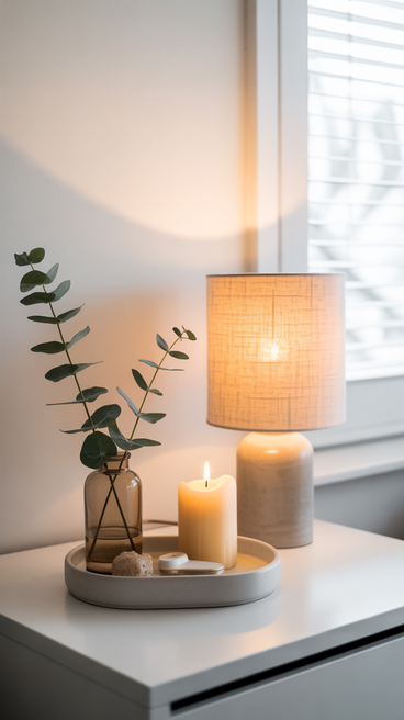 Start with a tray or small decorative base. Then layer a few functional items such as a lamp, candle, and a small plant. Keeping the arrangement minimal prevents visual clutter.