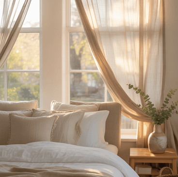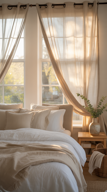 Replacing heavy curtains with sheer or lightweight linen curtains allows sunlight to filter through softly. The result is a room that feels airy, bright, and peaceful.