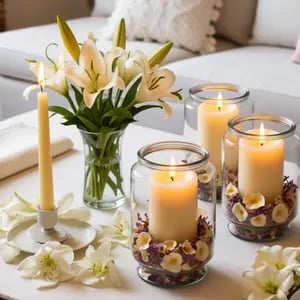 Candles aren’t just for scent—they’re powerful decor accents. Choosing candles in soft neutrals or simple glass containers adds height and elegance to any surface. Grouping one or two creates a refined, spa-like feel that instantly elevates a room.