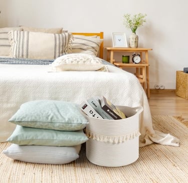 Texture is what keeps a light bedroom from feeling flat. Spring decor works best when soft materials are layered thoughtfully—linen pillows, a lightweight throw, or a woven accent add warmth without heaviness. When textures stay within a neutral palette, the room feels cozy and inviting while still looking airy and bright. This balance is what gives spring bedrooms that relaxed, elevated look.
