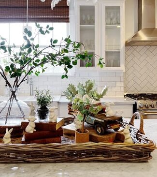 Spring kitchens shine when decor feels intentional but minimal. Clearing unnecessary items from countertops is often the first step toward a brighter look. Once the space feels edited, adding just a few light-toned accents brings the spring feeling in without clutter. A simple tray with neutral ceramics, a small bowl, or a touch of greenery creates a styled moment that still feels practical.