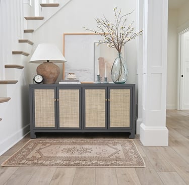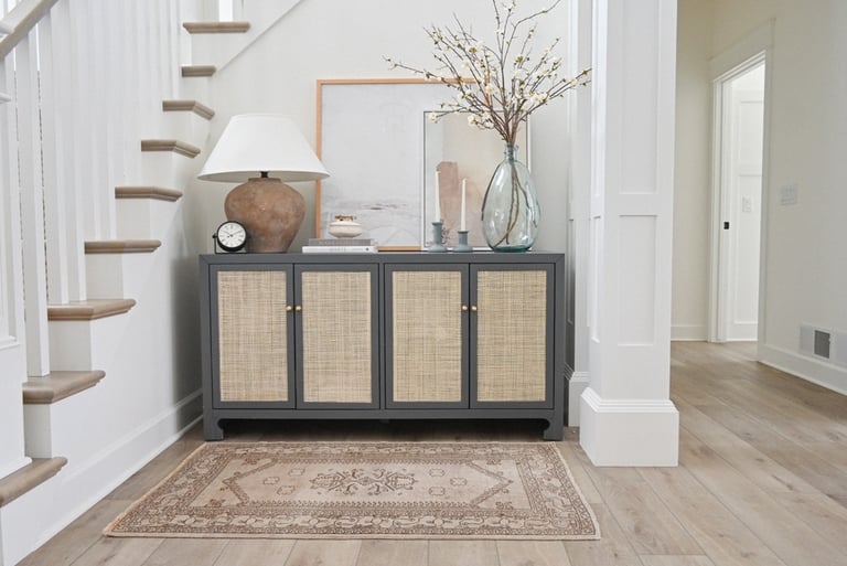 Natural textures add warmth without darkening the space, making them ideal for spring entryways. Woven baskets, light wood accents, or a subtle runner bring softness and dimension while keeping the look grounded. When these textures stay within a neutral palette, they enhance brightness and help the entryway feel cohesive rather than overly styled.