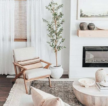 Seating areas play a major role in how bright your living room feels. Sofas and chairs tend to anchor the space visually, so lightening them up has an outsized impact. Adding a lightweight throw casually draped over an armrest softens the look, while neutral pillows with subtle texture keep the room from feeling flat. Even neglected corners can be refreshed for spring with a single statement piece, like a tall vase with greenery or a floor basket that adds texture without heaviness. When these elements are styled with intention and restraint, the living room feels brighter, more breathable, and perfectly aligned with the season.