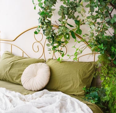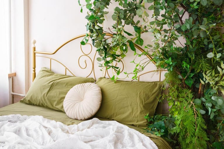 Greenery brings life into a bedroom without adding visual clutter. A single plant on a dresser, a soft eucalyptus stem in a vase, or a small potted plant near a window adds height and movement that naturally brightens the room. Keeping the greenery simple and natural-looking helps maintain a calm atmosphere, which is essential for a restful bedroom while still capturing that fresh spring feeling.
